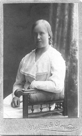 Foto: en porträttbild av Alma Stoor. Bilden är tagen ungefär vid samma tidpunkt som Alma skrev sin dagbok, alltså ca. 1917-1918. Fotograf okänd men fotograferat vid Nyblin & Co i Wasa.