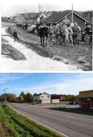 Tyska trupper som landsteg i Hangö den 3.4.1918 är på väg mot Helsingfors nådde här på fotot Masaby i Kyrkslätt den 9.4.1918.