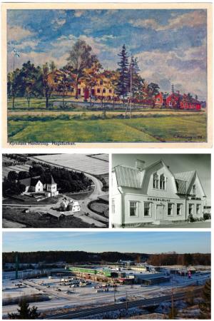 Postkort av Kyrkslätt Handelslags Haga huvudaffär under 1930-talet mellan kyrkan och järnvägsstationen.