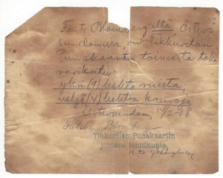 Kvitto som rödgardisterna lämnade åt värdinnan Hilda Blomberg på Rödje-Fants hemman 14.2.1918